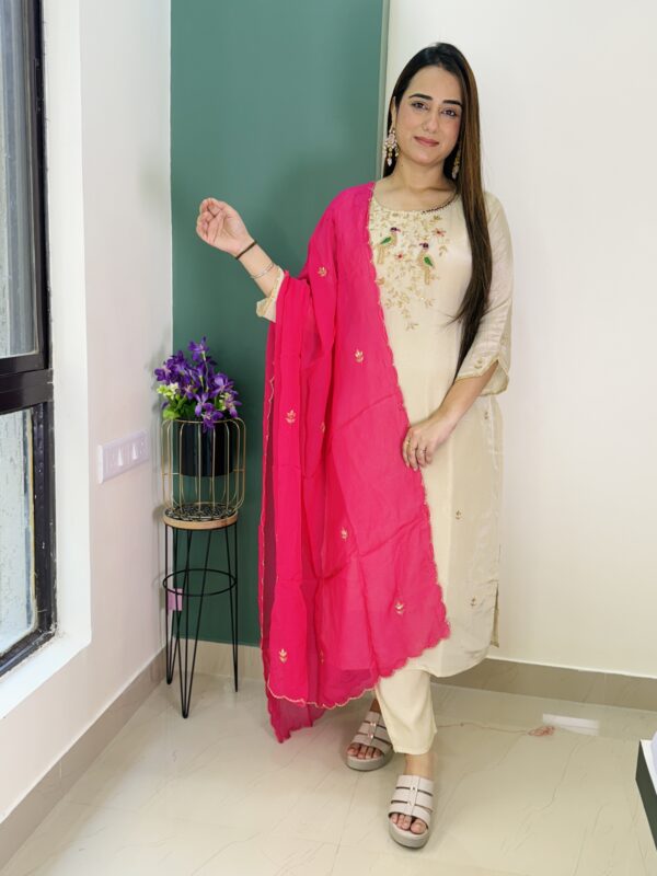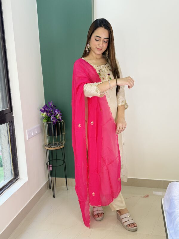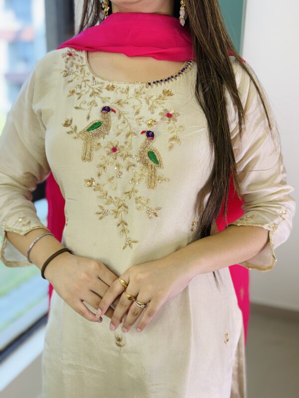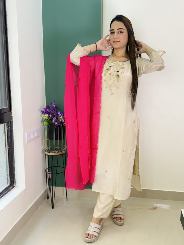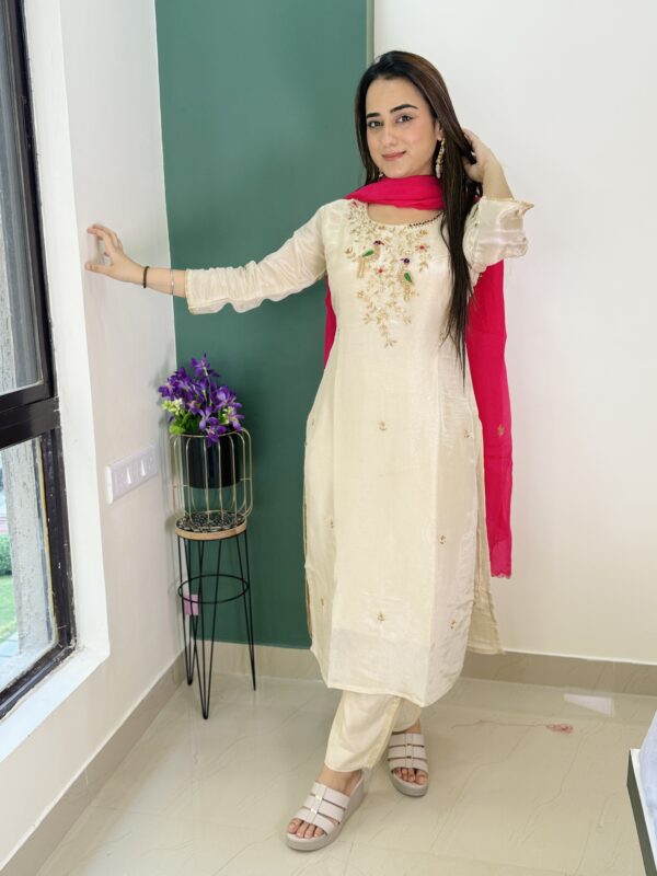 Material – Pure shimmer tissue silk with cotton lining and viscose organza dupatta