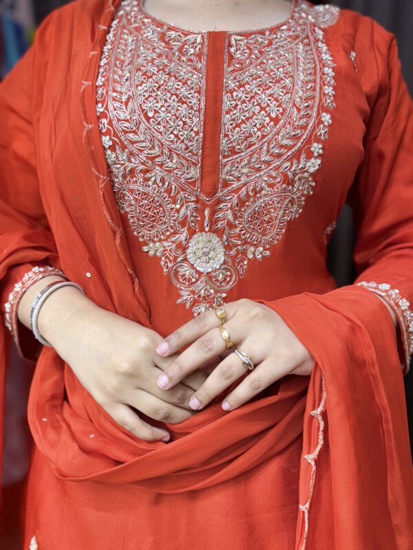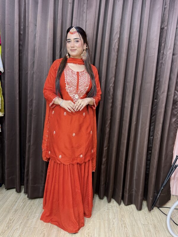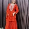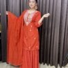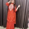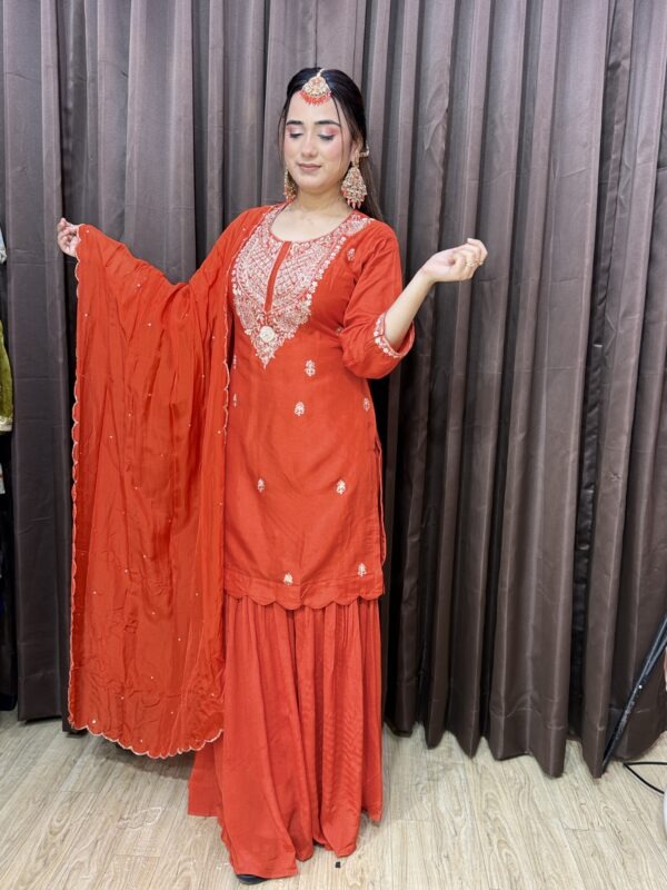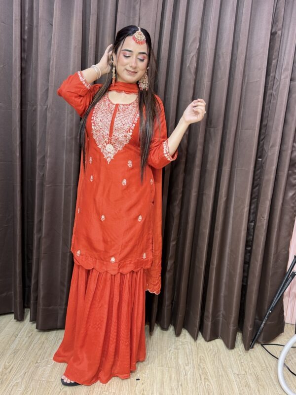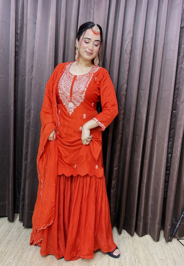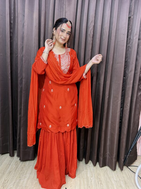Material- Chinon silk sharara. Russian silk kurta, viscose organza dupatta